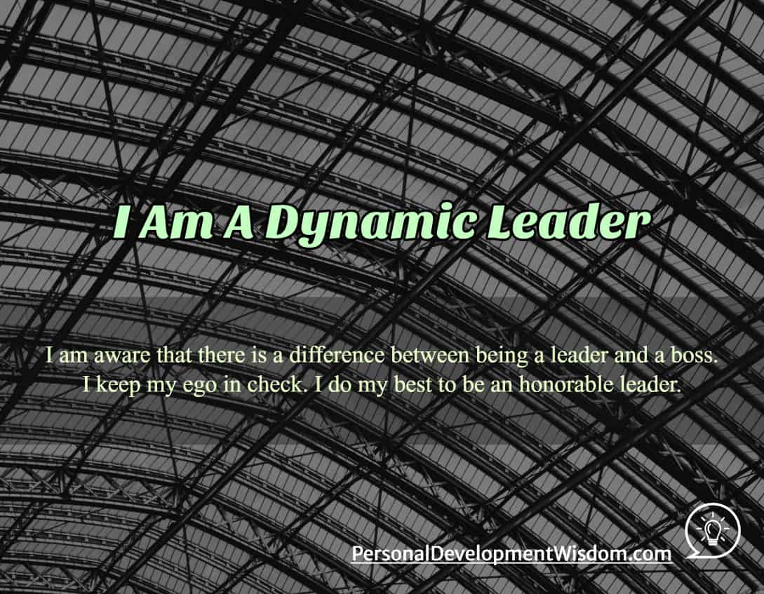 I recognize the responsibility it takes to be a dynamic leader. I realize I must be humble and confident at the same time. I am self-assured now. I stand tall. To be a leader is an honor. I respect all people and am honored to be a respected leader.