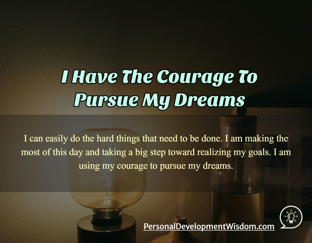 Today, I allow my courage to display itself to the world. I can easily do the hard things that need to be done. I am making the most of this day and taking a big step toward realizing my goals. I am using my courage to pursue my dreams.