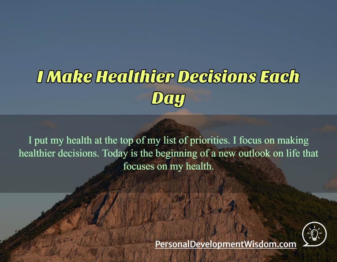 Today, I put my health at the top of my list of priorities. I focus on making healthier decisions. Today is the beginning of a new outlook on life that focuses on my health.
