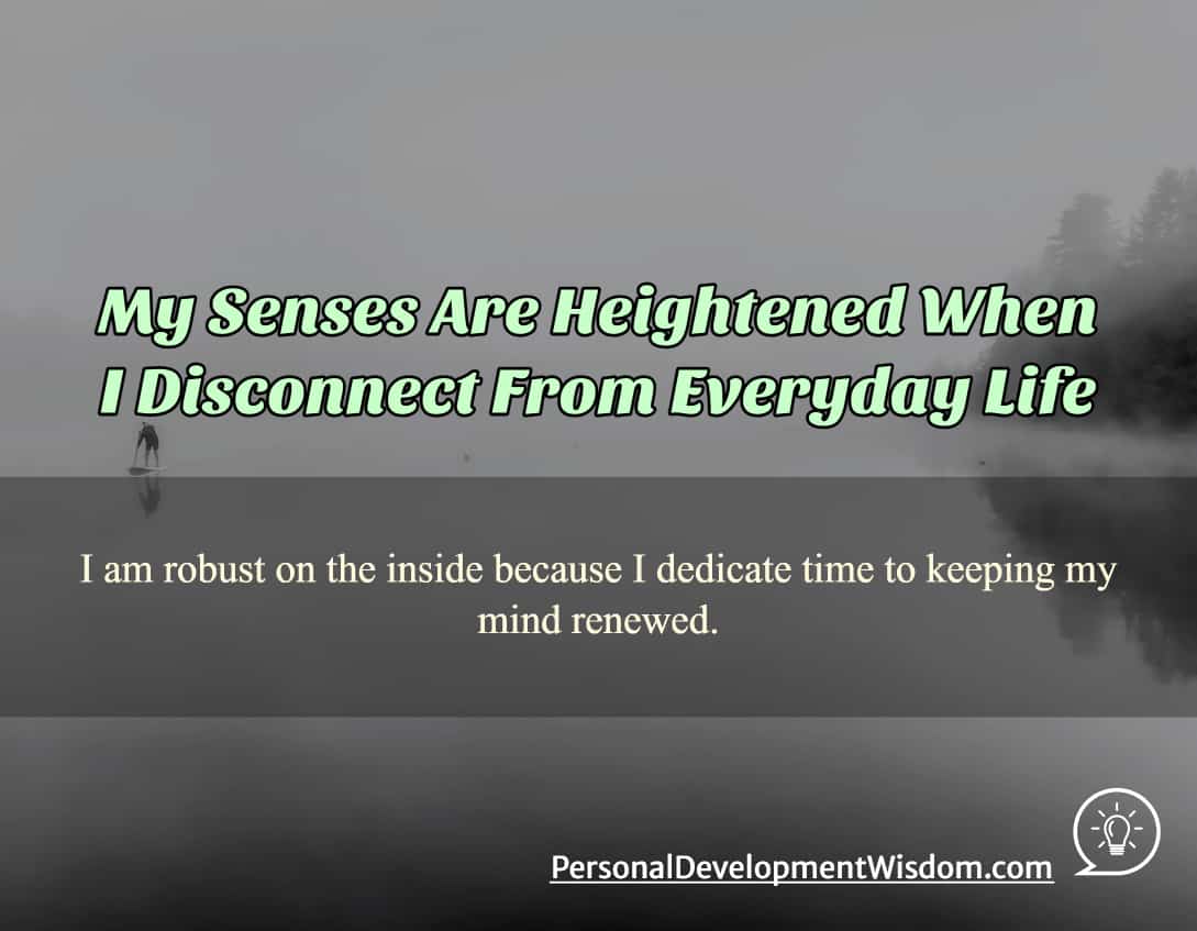 Today, disconnection from daily life is a built-in remedy for staying connected with myself. I am robust on the inside because I dedicate time to keeping my mind renewed.