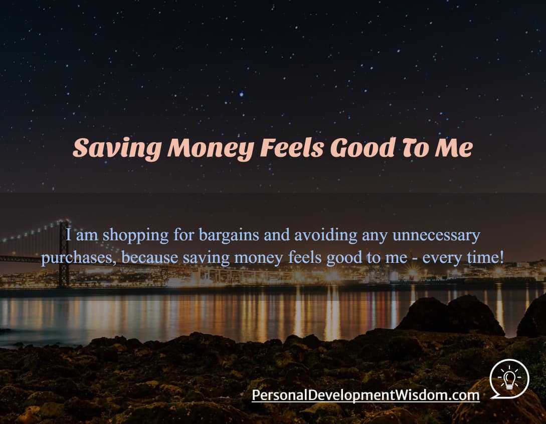 Today, I am looking forward to spending my money wisely. I am shopping for bargains and avoiding any unnecessary purchases, because saving money feels good to me – every time!