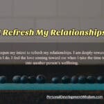 Relationships are important to me. I renew my vows to myself and others. I am taking the time to enhance my relationships.I do my part to be a good partner. I put in 100% effort in communicating in a way that works for both of us.I do research into what is important in a relationship. I find out the language of love that works for all my relationships, including … [Read more...] about I Refresh My Relationships