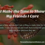My friends know how much I care about them, because I make time in my life for them. I am a busy person, but I am willing to make time for my friends. I value my friends and want them to feel the joy of knowing how precious they are.When I plan my week, I ensure that I am spending part of my time with my friends. I am blessed with so many wonderful friends that it can be … [Read more...] about I Make the Time to Show My Friends I Care