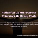 There is meaningful value in looking back at the beginning of my journey. It is a source of drive and inspiration.I commit some time each day to think back to where things started. Regardless of the size of my goal, it is always worthwhile to understand the beginning. I trace my steps throughout my journey thus far to acknowledge my accomplishments.When I consciously … [Read more...] about Reflection On My Progress Refocuses Me On My Goals