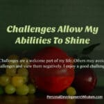 Challenges are a welcome part of my life. Others may avoid challenges and view them negatively. I enjoy a good challenge.When life is easy, I become stagnant. Challenge gives me the opportunity to grow as a person. I move closer to becoming the best possible version of myself when I face, and overcome, obstacles.Challenges provide the opportunity to learn. There is … [Read more...] about Challenges Allow My Abilities To Shine